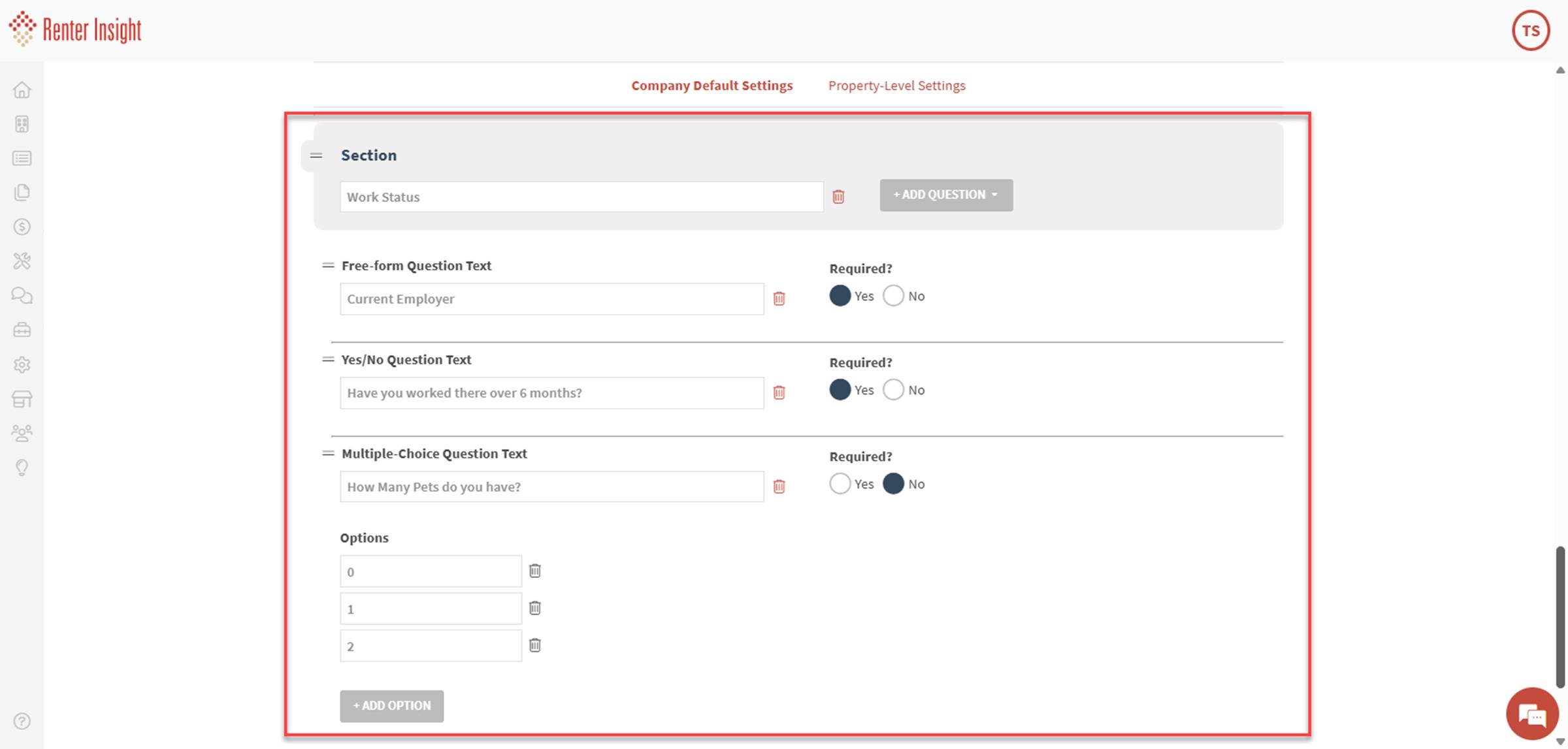 - Note: The default is to edit the Company Default Settings, you can select Property Level Settings if