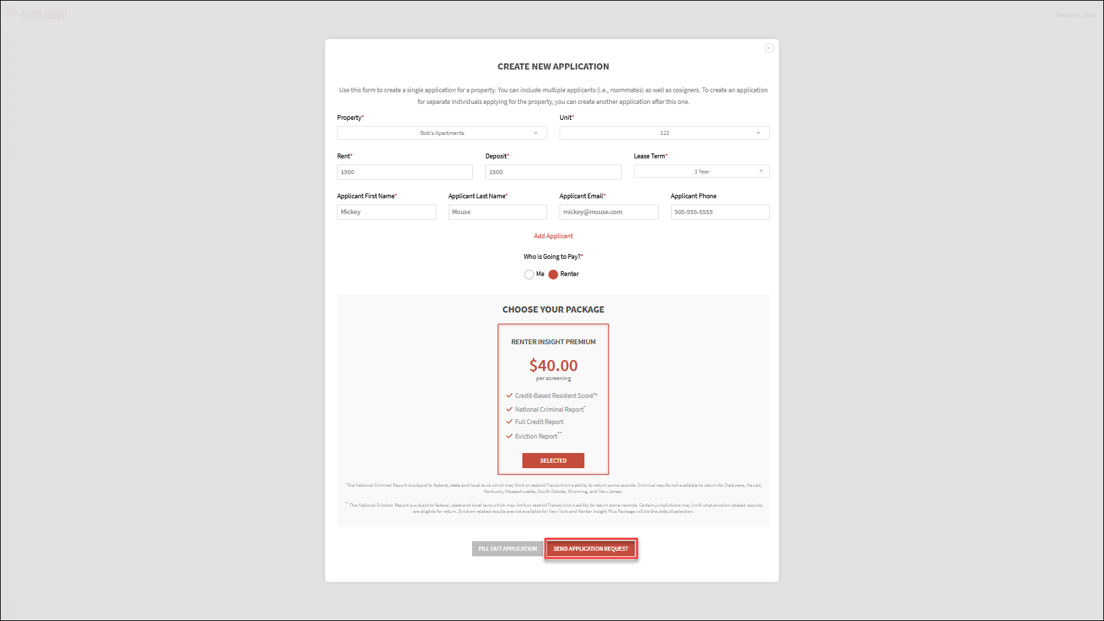 Select property and unit and enter applicant information. You can enter up to