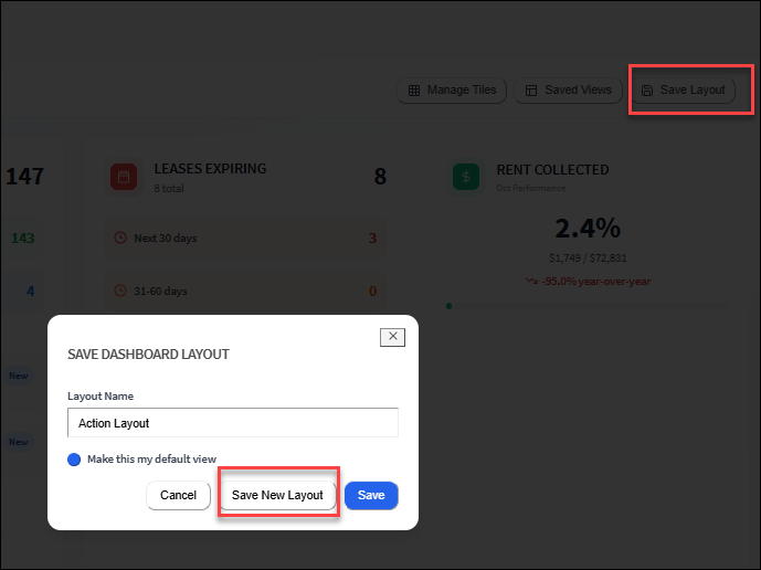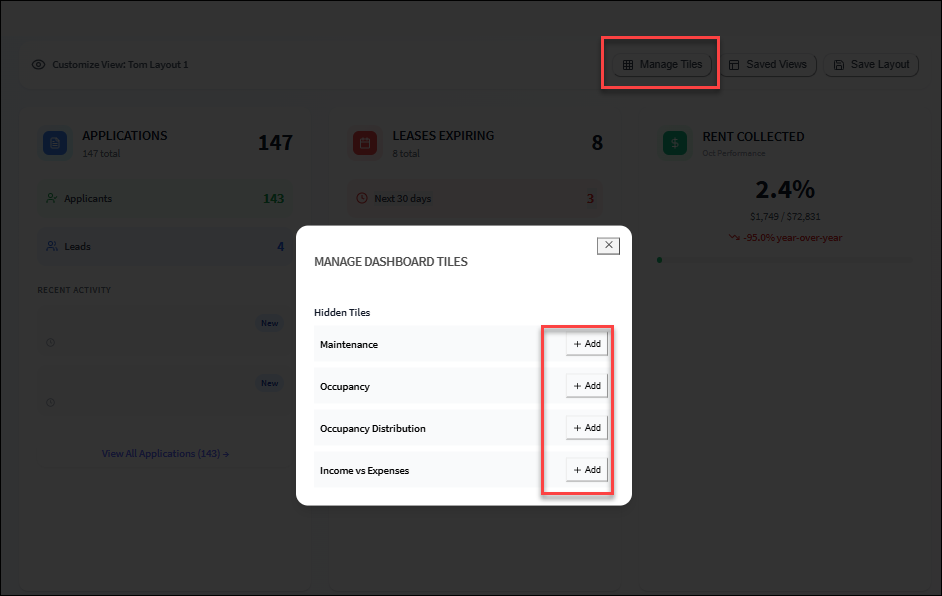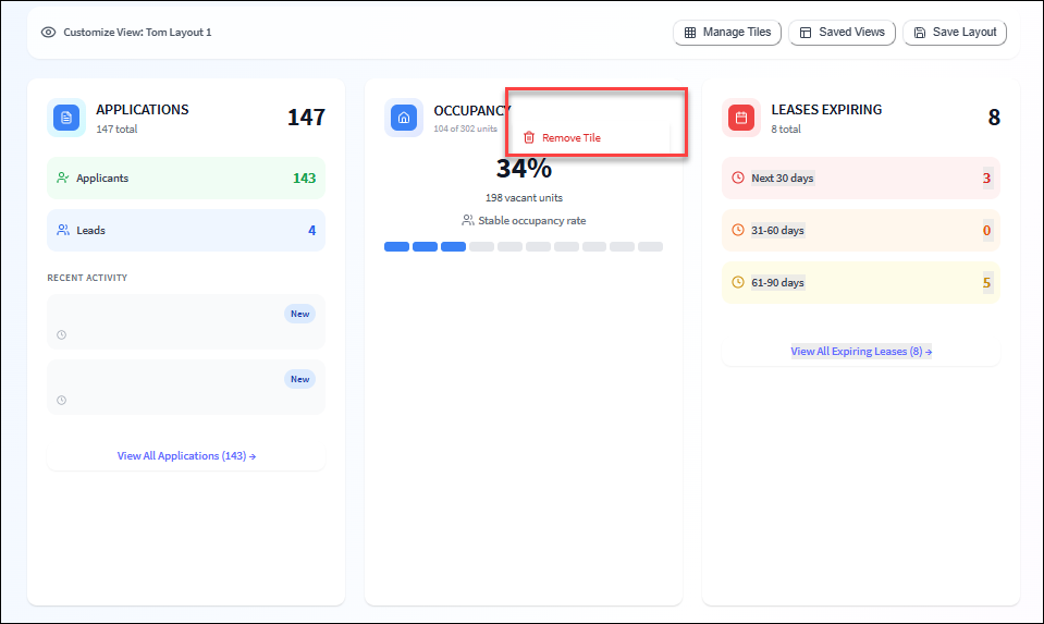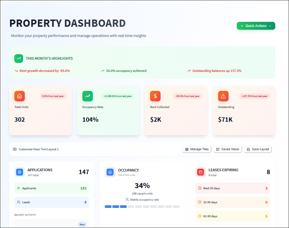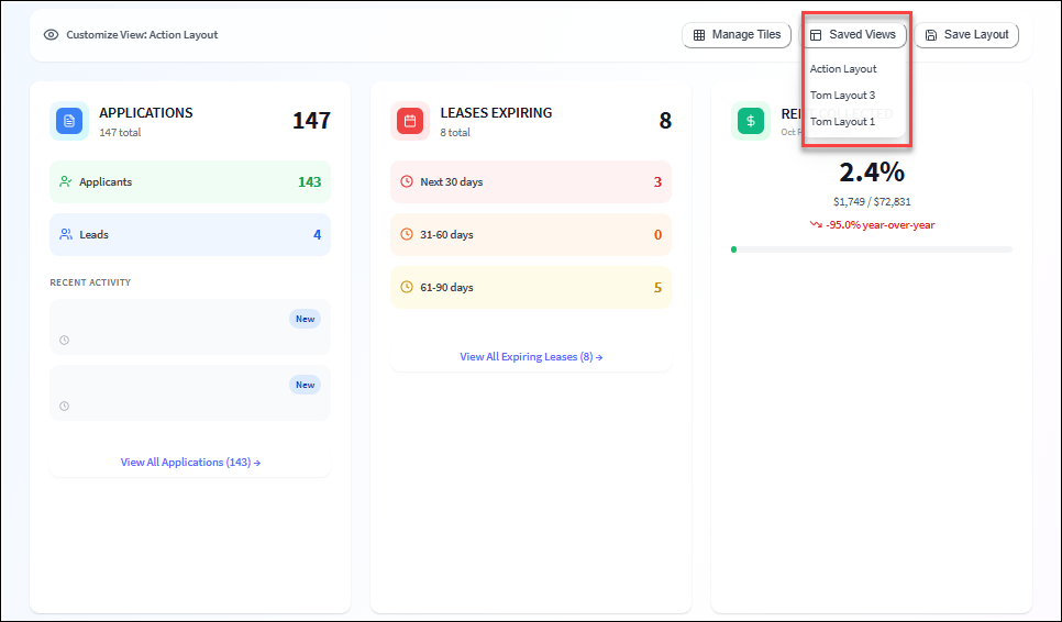 Dashboard (Portfolio) The portfolio dashboard provides you with a snapshot of your properties and summarizes property information so you can quickly take action and operate more efficiently. All dashboard tiles are active and you can drill into each ...